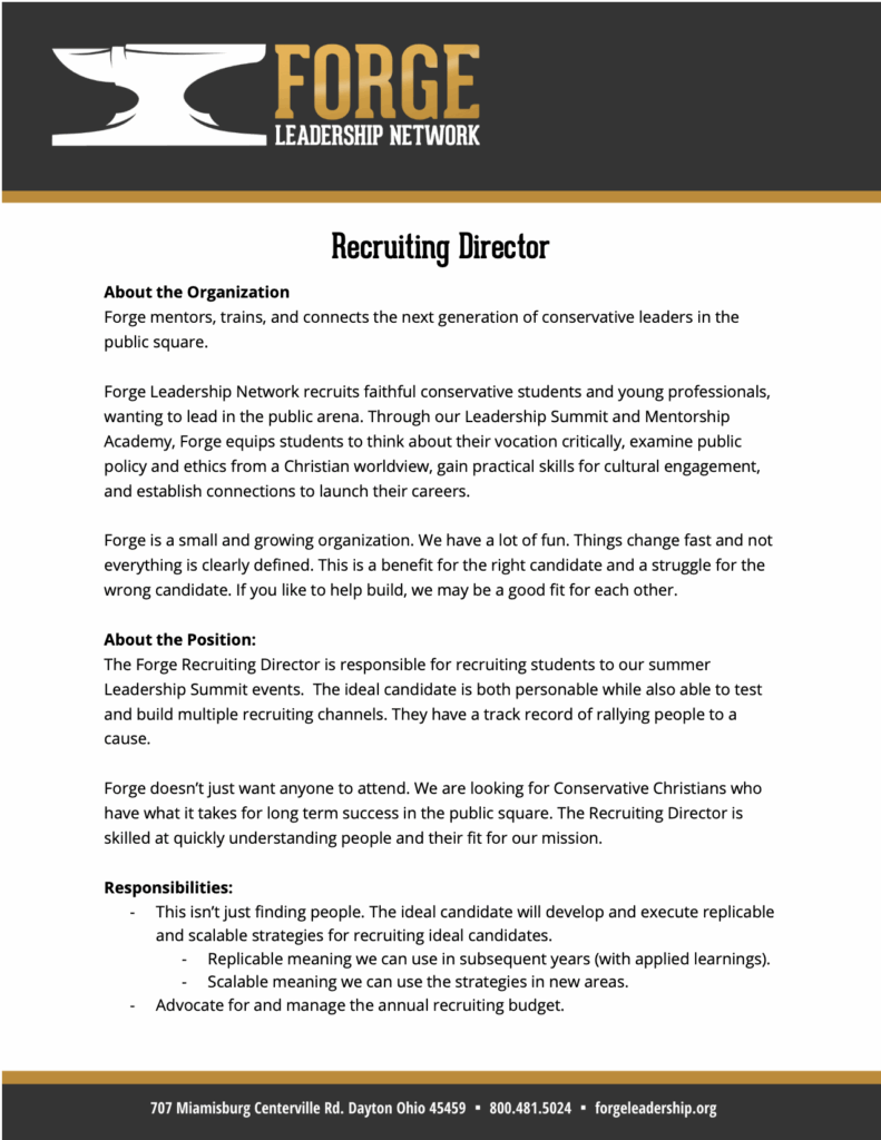 Forge Leadership Network is seeking a full-time Recruiting Director to join our growing organization. The ideal candidate is both personable while also able to test and build multiple recruiting channels. They have a track record of rallying people to a cause. The Recruiting Director is skilled at quickly understanding people and their fit for our mission.